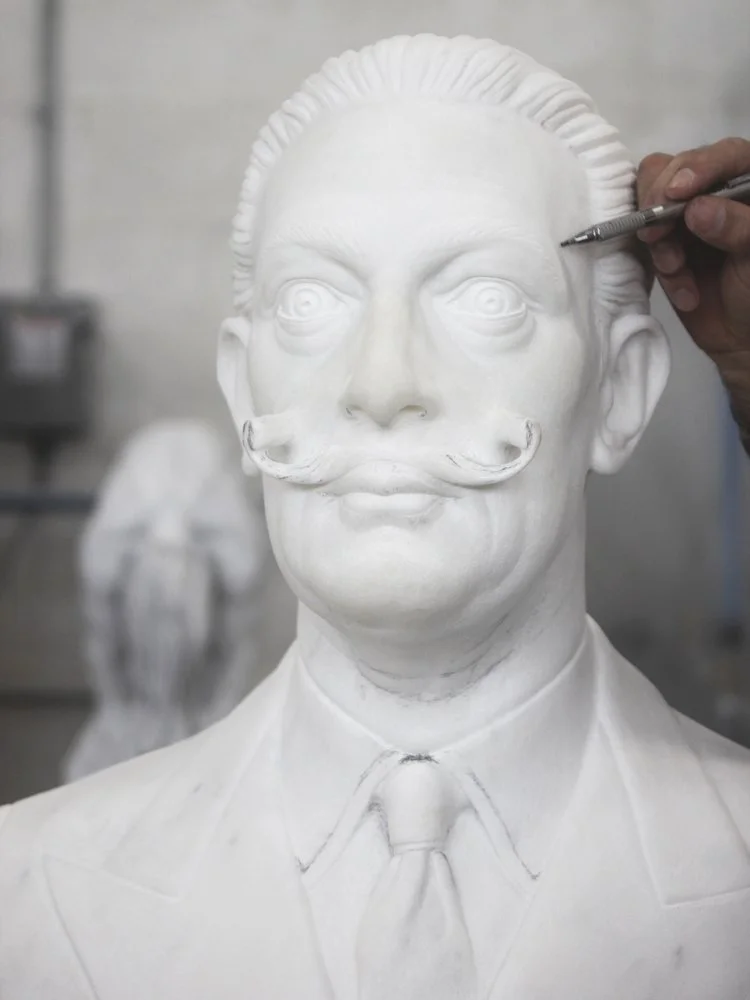 Digitally created, robotically milled, and incredibly detailed and finished by skillful artistic hands. We wanted to capture his uniqueness in this bust made of Danby Marble. It is rendered 1.5 times actual scale to capture his bigger than life persona.
